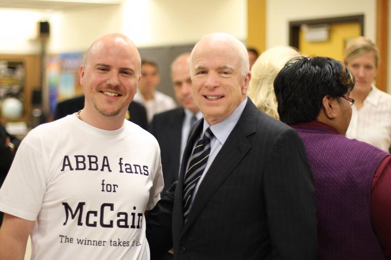 In 2008 I started ABBA fans for McCain and volunteered in McCain’s campaign during a summer month. I was awarded Best Campaigner and got to meet him before a campaign event in Reno, Nevada.