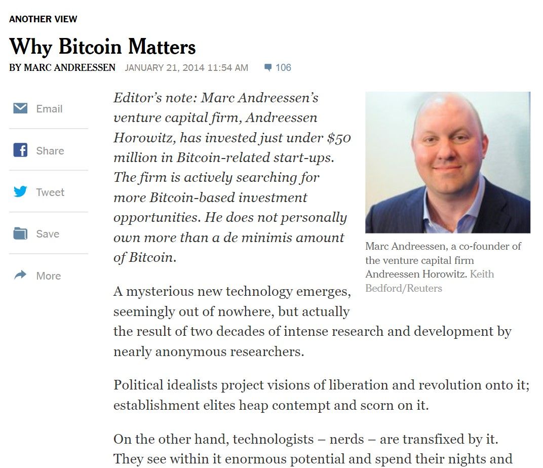 In 2014, I was lucky. Then I stumbled upon an article by Marc Andreessen. I remembered him from the '90s when he started Netscape. Now he argued that Bitcoin could be as big as the personal computer, or the web. If he believed it, I should at least understand what it is.